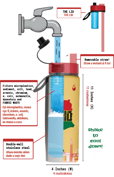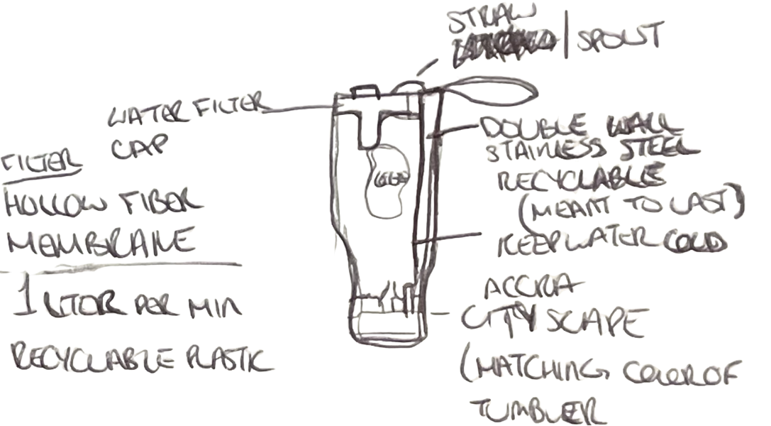 The GH²O product was designed for performance, durability, and everyday usability. From the first sketch, I wanted this product to feature: double-wall stainless steel insulation to maintain temperature in hot climates, a hollow fiber membrane, and fast charcoal-activated filtration at 1 liter per minute. It also boasts a wide opening for ice flow, while a removable straw makes cleaning easy. The filtration system uses ultra-powdered activated charcoal to capture microplastics, sediment, silt, harmful bacteria, mixed metals, and fabric waste.