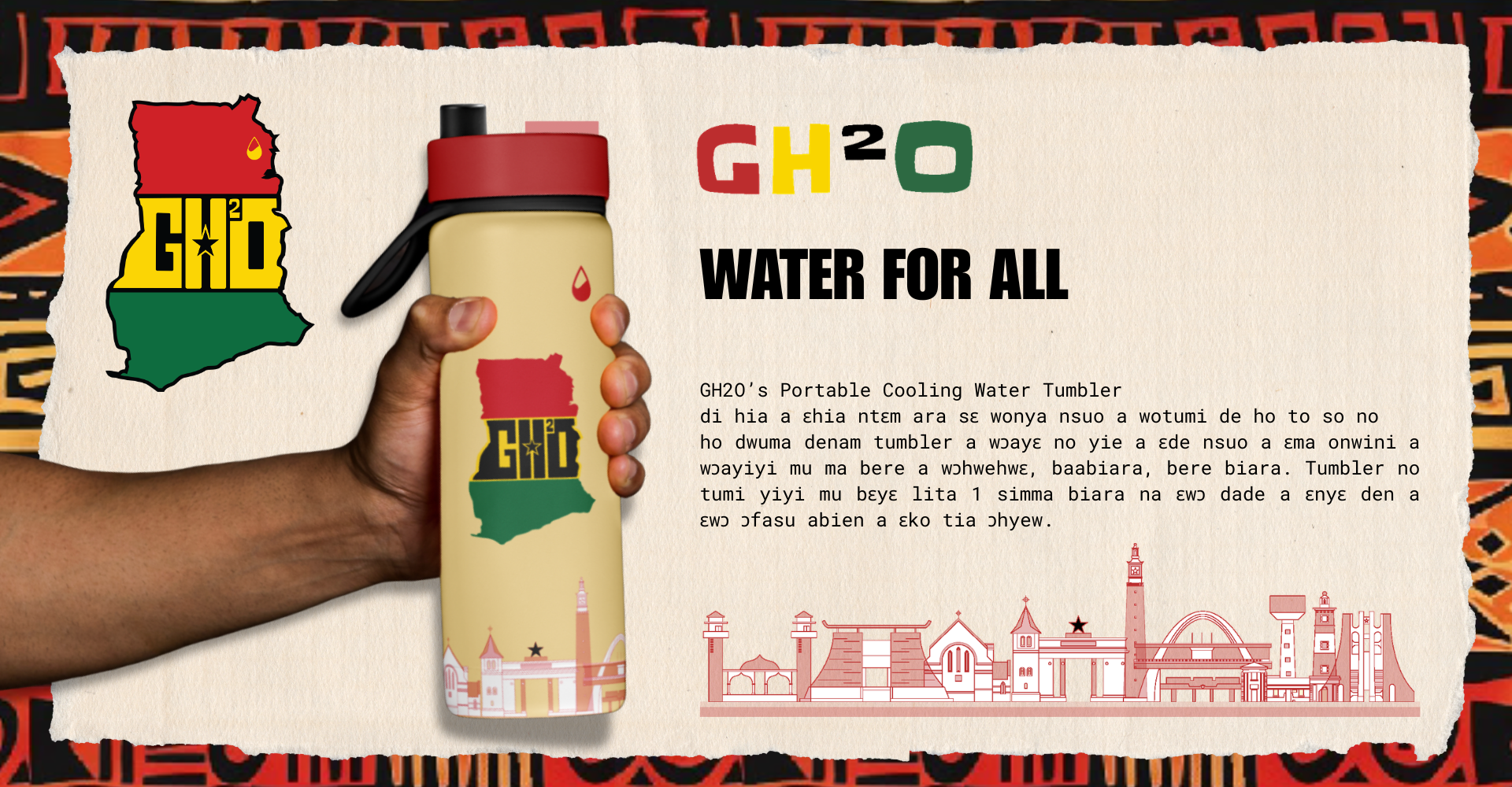 A town as resilient as Accra deserves a product and brand system just as brilliant! GH²O is designed to be immediately recognizable, accessible, and adaptable. The primary logo is shaped like Ghana, creating instant geographic recognition for residents, partners, and collaborators. Bright color usage and direct visual language reflect the flag, translating complex environmental issues into clear, powerful communication.